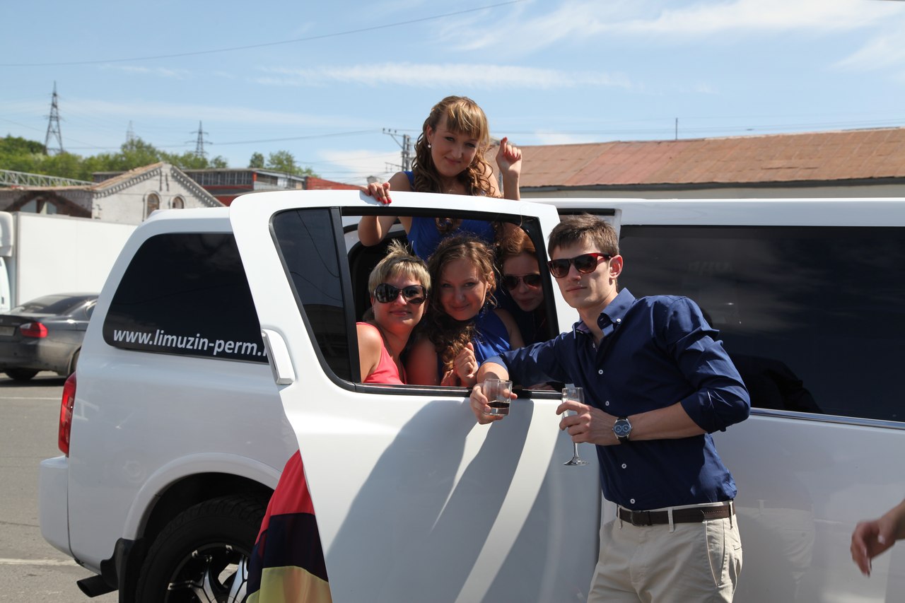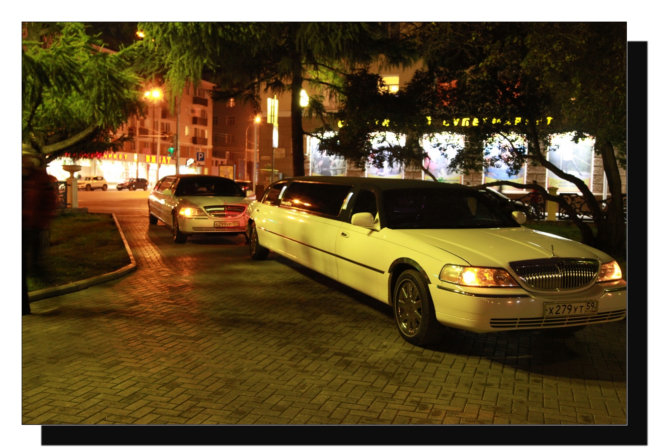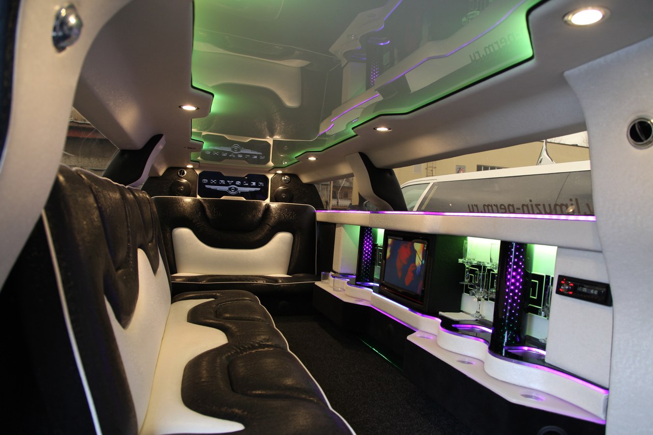 Белый, 20 человек. Самый вместительный лимузин в Перми. Разноцветная неоновая подсветка как внутри так и снаружи. Светлый и динамичный салон.