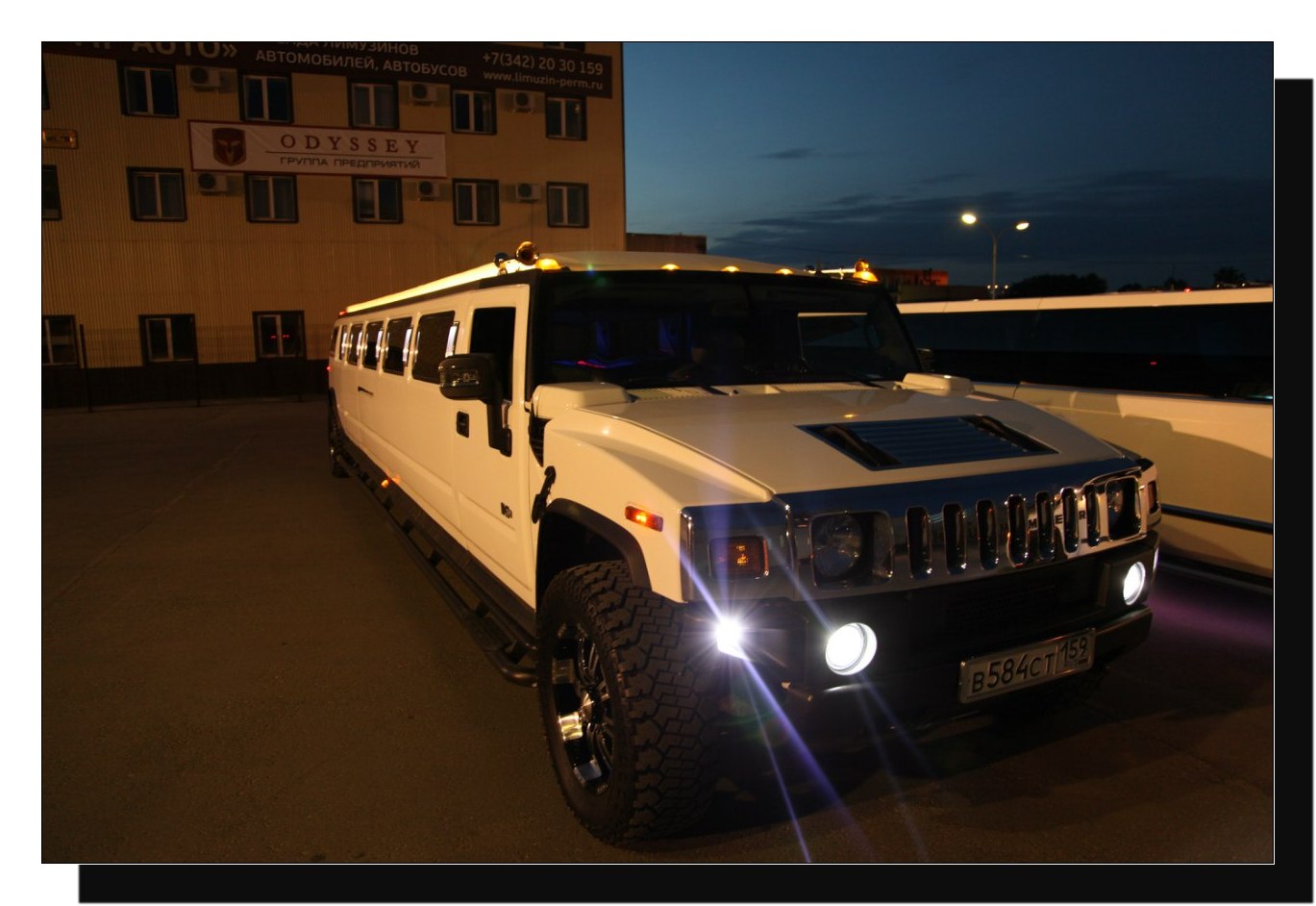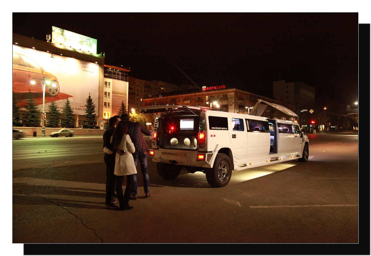 Белый, 15 человек. Ламбо двери. Средняя дверь - "крыло чайки". Музыка CD/DVD/МР3/USB. Диско пакет для улицы с лазерным шоу. Впечатляющие габариты автомобиля, который притягивает взгляды прохожих. Кожаный салон с множеством LED подсветок, лазеров и стробоскопов. Ваша фотосессия, с этим гигантом, будет неповторима и незабываема.